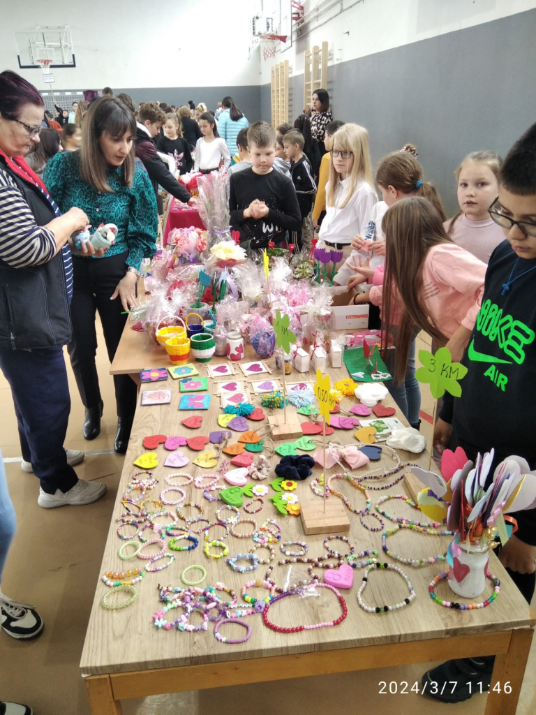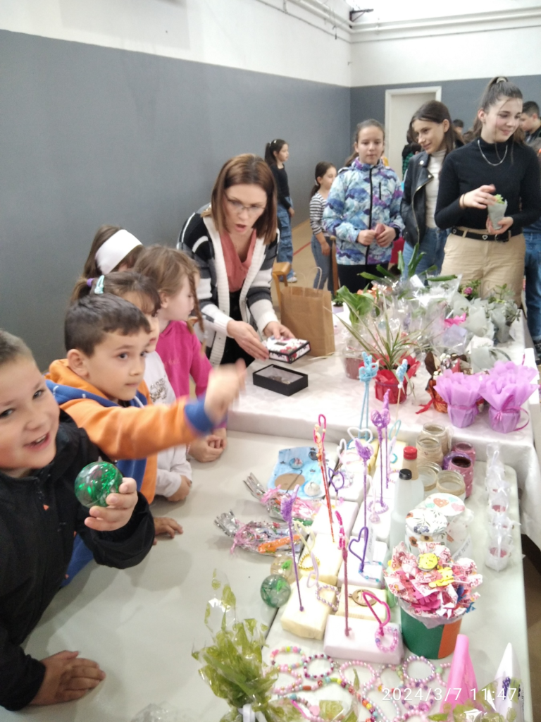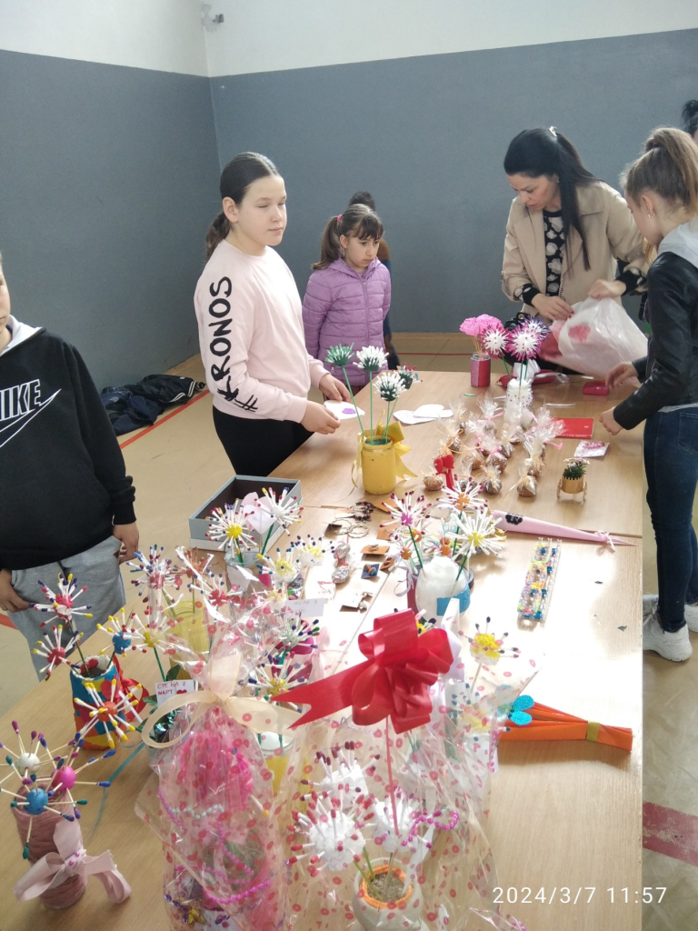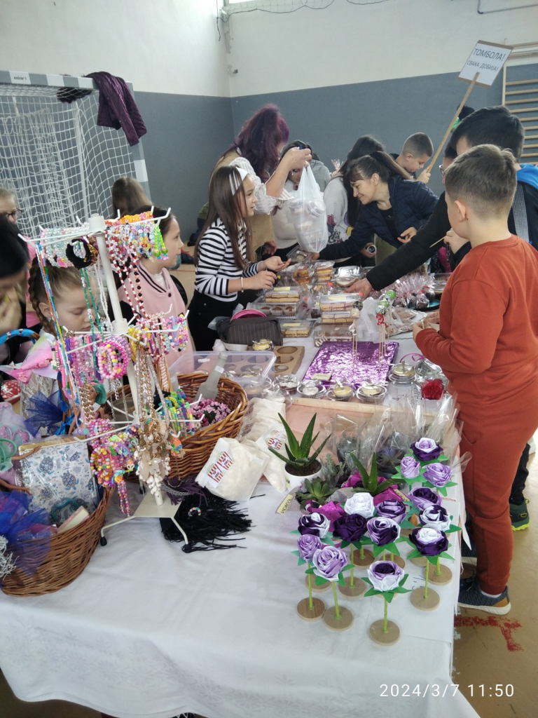 Осмомартовски базар ученика наше школе. Ученици су осмислили, а њихове вриједне руке припремиле мноштво занимљивих предмета, украса, колача… За сваког понешто, а највише за мајке, баке, тетке… да им буде срећан њихов дан – Дан жена.