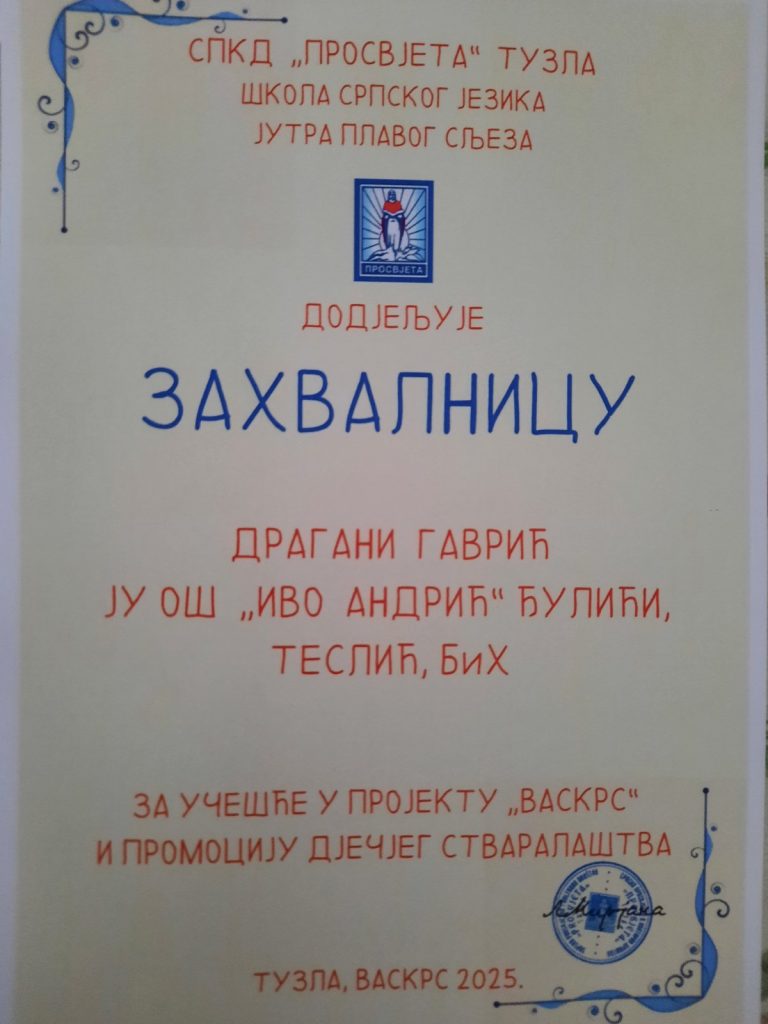 Ученици овог одјељења, уз подршку учитељице Драгане Гаврић, учествовали су и на конкурсу СКПД „Просвјета“ из Тузле, а под називом „У СУСРЕТ ПРАЗНИКУ НАД ПРАЗНИЦИМА“, гдје су својим радовима увеличали прославу Васкрса, уједно исказујући своју креативност и стваралаштво.