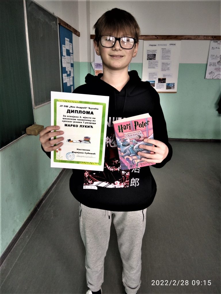 На школском такмичењу из СРПСКОГ ЈЕЗИКА за ученике седмог разреда у школској 2021/2022. години, најуспјешнији су били ученици ВЛАДАН ЈОВИЧИЋ 7/2 (1. мјесто) и МАРКО ЛУКИЋ 7/2 (2. мјесто).